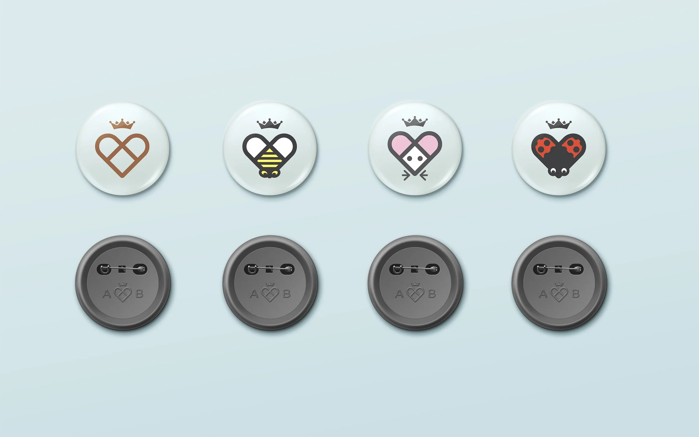 Le coeur, formé des lettres A et B, représente la marque et ses valeurs fondamentales. La combinaison des couleurs, symboles et typographie créée une plateforme visuelle élégante et riche, permettant de parler directement aux parents et grands-parents. En parallèle, en jouant avec le symbole du coeur, nous avons donné vie à trois personnages ciblant directement les enfants lorsque nécessaire.